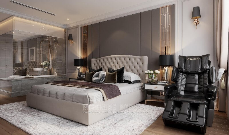 Giường ngủ biệt thự cao cấp được thiết kế theo phong cách tân cổ điển nhẹ nhàng mà đơn giản, phần đầu giường cách điệu lạ mắt được gia chủ lựa chọn trong mẫu thiết kế phòng ngủ này