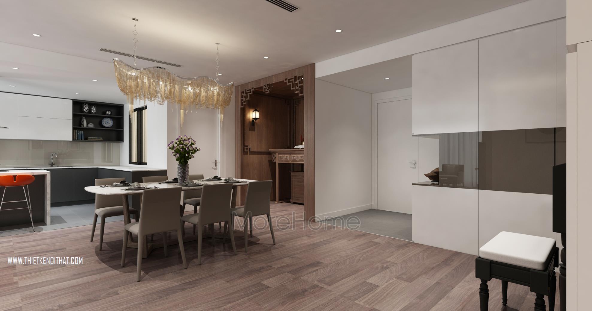 Thiết kế nội thất không gian thờ cúng được gia chủ vô cùng chú trọng. Không gian bàn thờ linh thiêng được sắp đặt tại vị trí trung tâm của căn nhà. Đây là một trong những thiết kế vô cùng quan trọng trong thiết kế nội thất, không gian thờ cúng không chỉ là nơi linh thiêng mà theo tục lệ dân gian, đây còn là nơi mang lại sinh khí cho căn nhà, mang điều tốt lành và sự bình yên đến với gia chủ. Chính vì ý nghĩa sâu xa này, chúng ta có thể dễ dàng thấy được đây là sự kết hợp không chỉ là vẻ đẹp thẩm mỹ mà đó còn là vẻ đẹp phong thủy và tâm linh khi thiết kế.