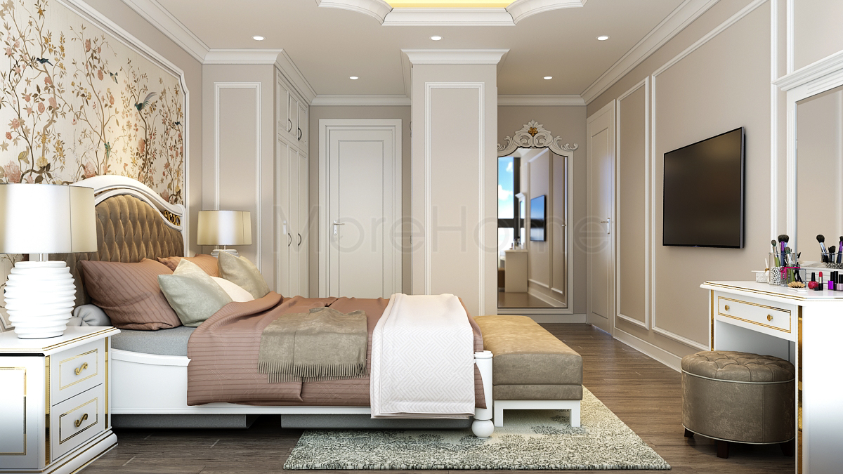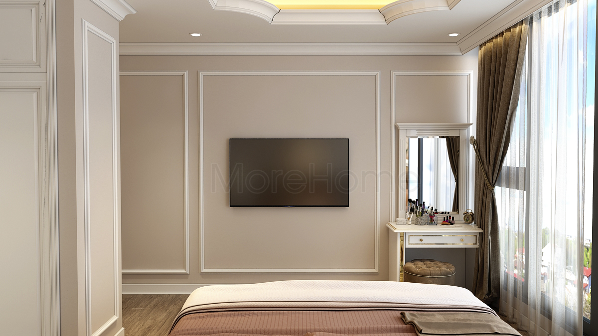 Thiết kế nội thất phòng ngủ tân cổ điển sử dụng tone màu nâu nhẹ làm điểm nhấn. Các thiết kế nội thất bàn ghế được kết hợp khéo léo các đường cong mềm mại, hay các chi tiết trạm khắc tinh tế, cầu kỳ vừa đảm bảo giữ được nét đẹp tân cổ điển lại mang lại cảm giác ấm áp và gẫn gũi. Ánh sáng tự nhiên luôn là yếu tố được gia chủ ưu ái hơn cả, thiết kế khung cửa kính rộng, đón ánh sáng tự nhiên vào phòng giúp mang sức sống cho căn phòng và gợi mở không gian thư giãn cho gia chủ. Ngoài ra, việc sử dụng gương phản chiếu trong căn phòng cũng là điểm đặc biệt giúp tạo độ cơi nới và tăng độ thoáng cho căn phòng.