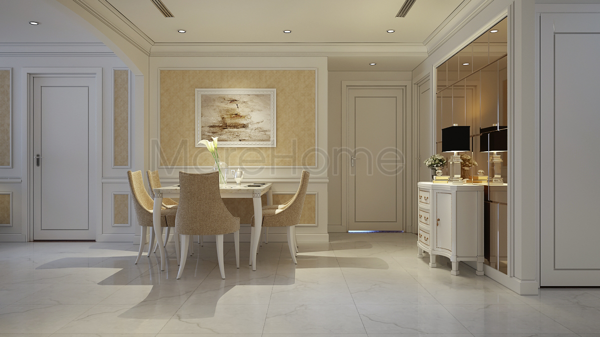 Thiết kế bàn ăn quây gọn, thiết kế cong nhẹ nhàng, đơn giản nhưng vẫn tạo được điểm nhấn. Thiết kế sử dụng hai tone màu cơ bản là vàng kim nhẹ nhàng và trắng, đây là hai màu sắc đặc trưng của tân cổ điển thể hiện sự sang trọng của thiết kế. Tranh treo tường là một vật trang trí không thể thiếu giúp không gian trở nên sống động và có hồn hơn.
