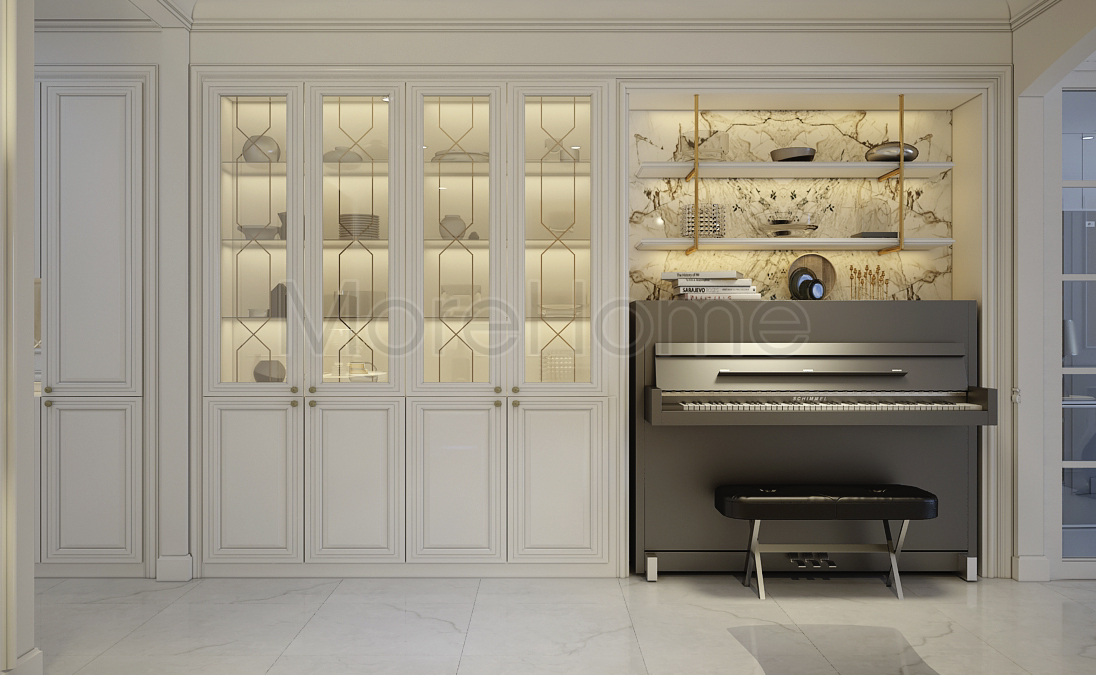 Tân cổ điển còn là sự tinh tế trong mỗi chi tiết trang trí tối giản – vẻ đẹp toát ra từ chính những đường cong tuyệt mỹ trong mỗi chi tiết nội thất. Đó không phải là những đường nét hoa văn cầu kỳ trong phong cách thiết kế nội thất cổ điển, mỗi một chi tiết đều toát lên sự tinh xảo mà đơn thuần chỉ là những nét lượn đầy gợi cảm trên ghế tựa, đèn chùm, tay vịn… Chúng nâng đỡ cho nhau, khi đặt cạnh nhau mới thực sự tỏa sáng, đồng điệu và hài hòa đến mê hoặc.