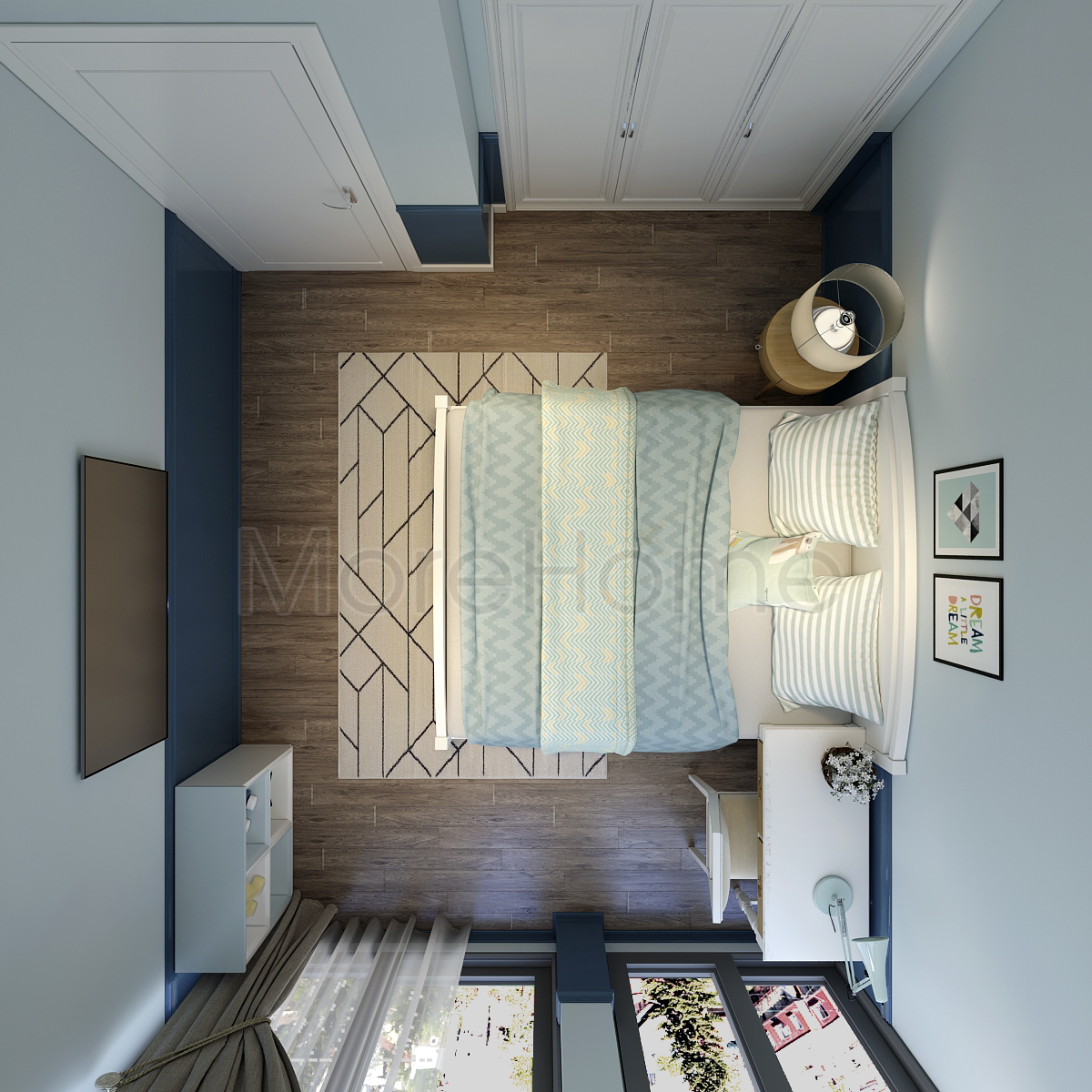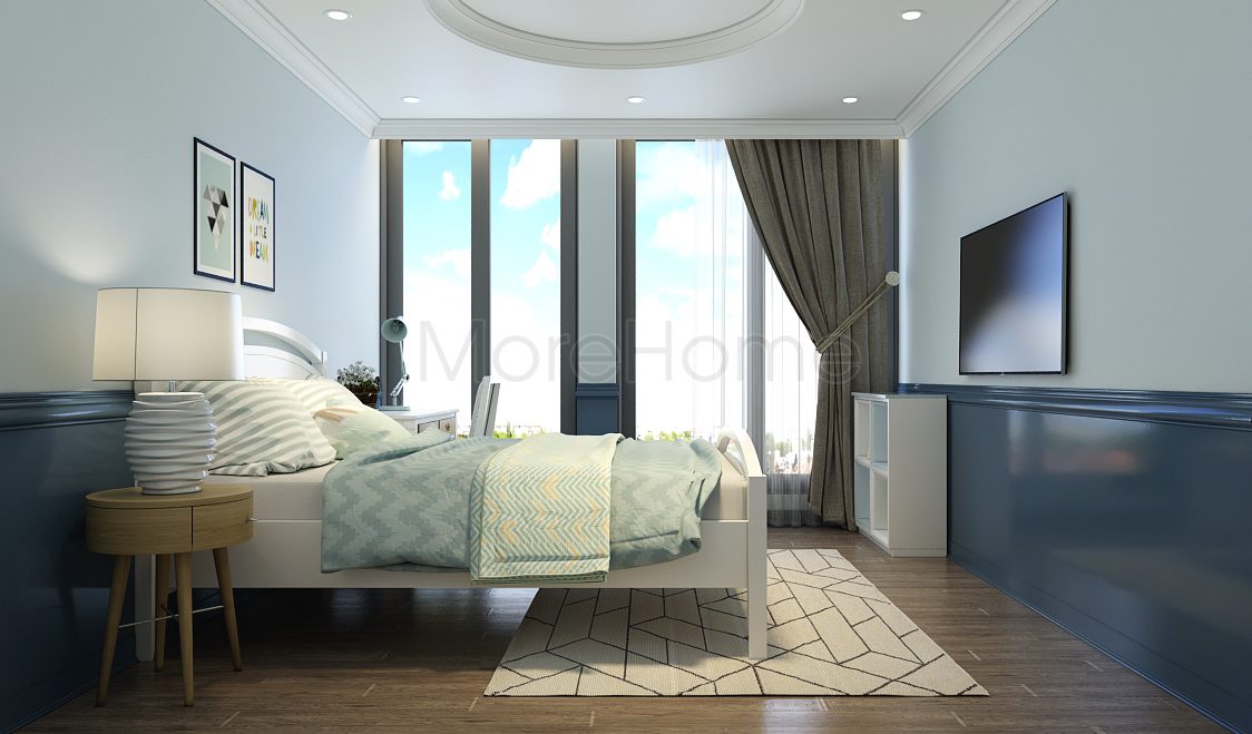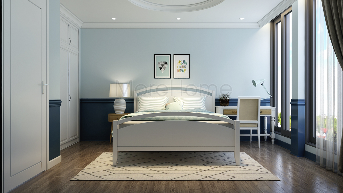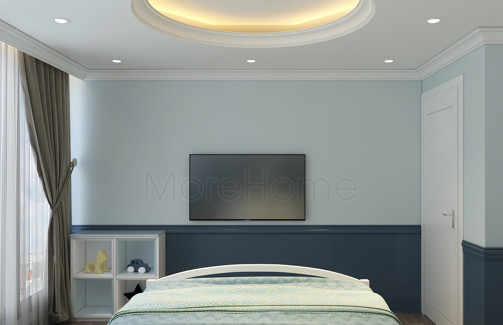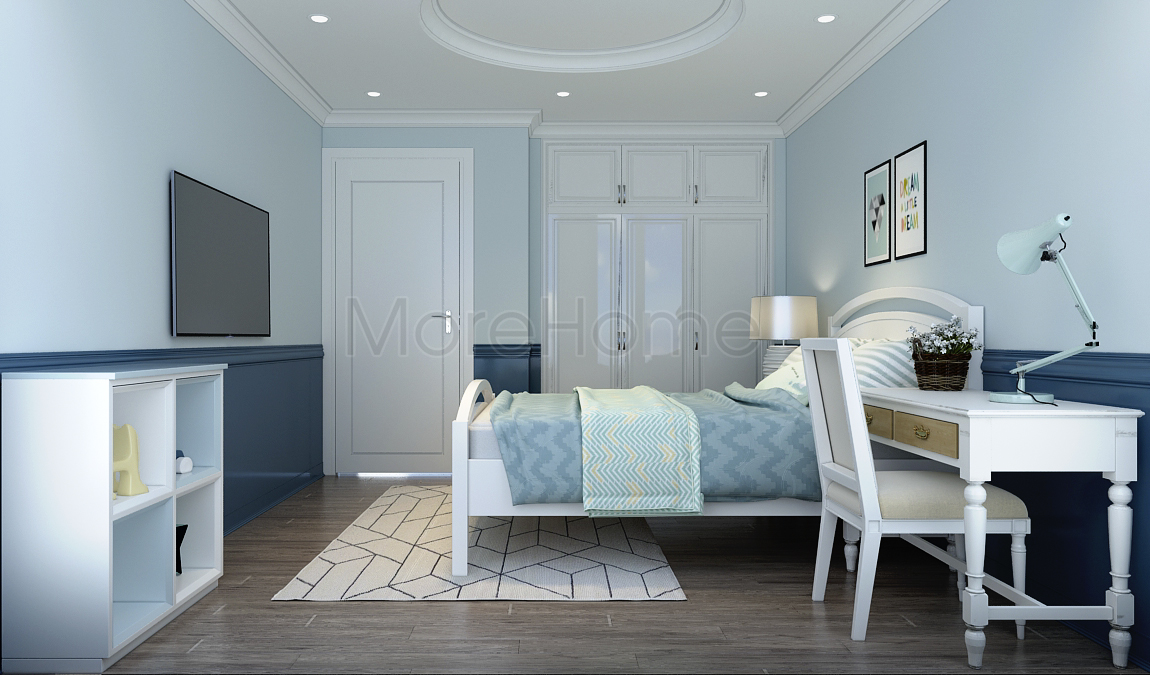Phòng ngủ cho trẻ được thiết kế với tone màu tươi sáng hơn, sắc xanh gợi trí tưởng tượng và mang đến sự bình yên. Các vật dụng được sử dụng không quá đi sâu vào chi tiết mà thay vào đó, đều là các vật dụng kệ thô kết hợp vừa tạo cảm giác đơn giản lại không làm ảnh hưởng đến tính công năng khi sử dụng.